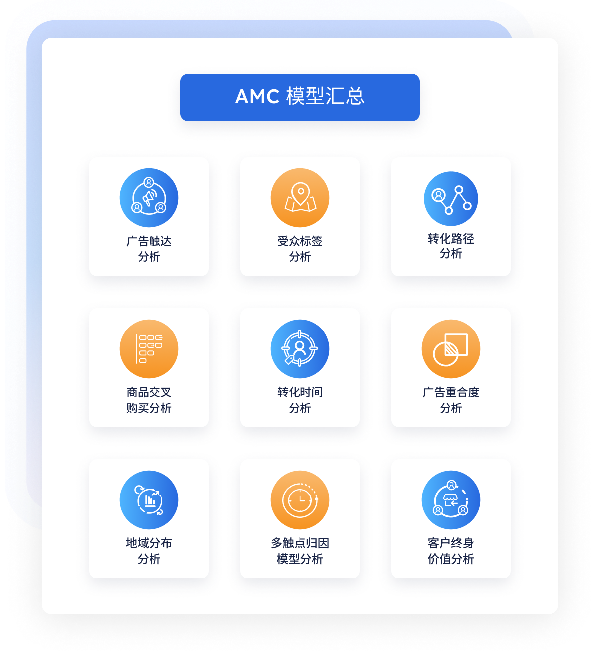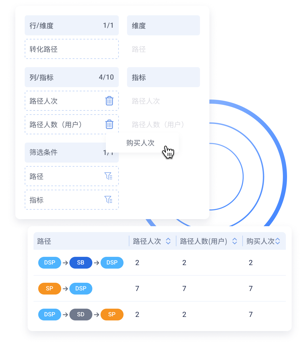 将复杂的的数据库语言转化成9大营销模型,点击即可查看消费者从第一次看到到购买的完整归因过程