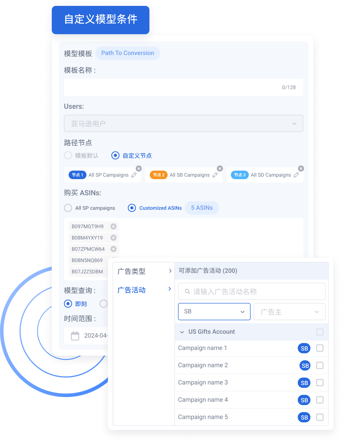 每个模型的参数,均支持灵活选择定义,包括广告活动、商品、时间段、归因条件等,简单拖拉拽即可进行添加、删除等操作
