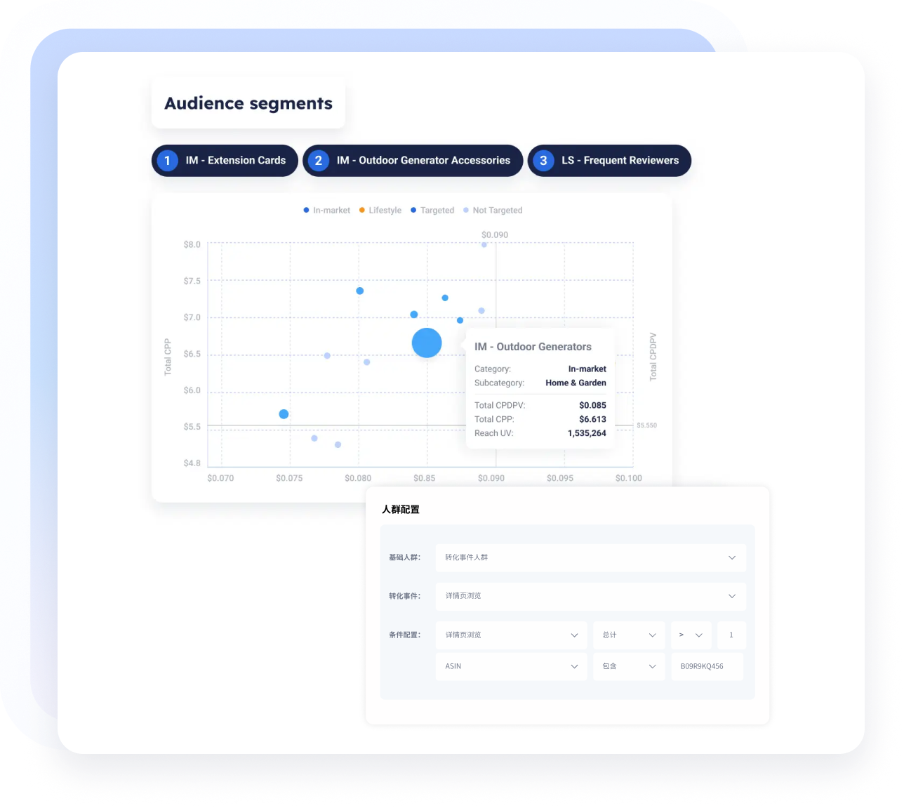 可灵活选择受众人群的配置条件,针对最有可能购买您产品的受众,提高转化率和营销投资回报率